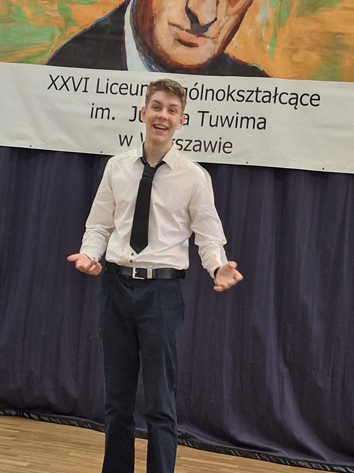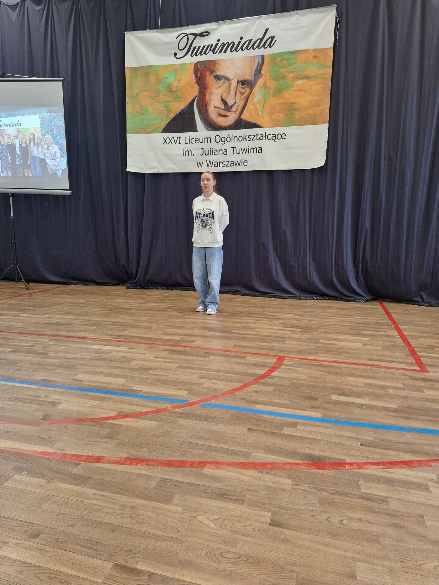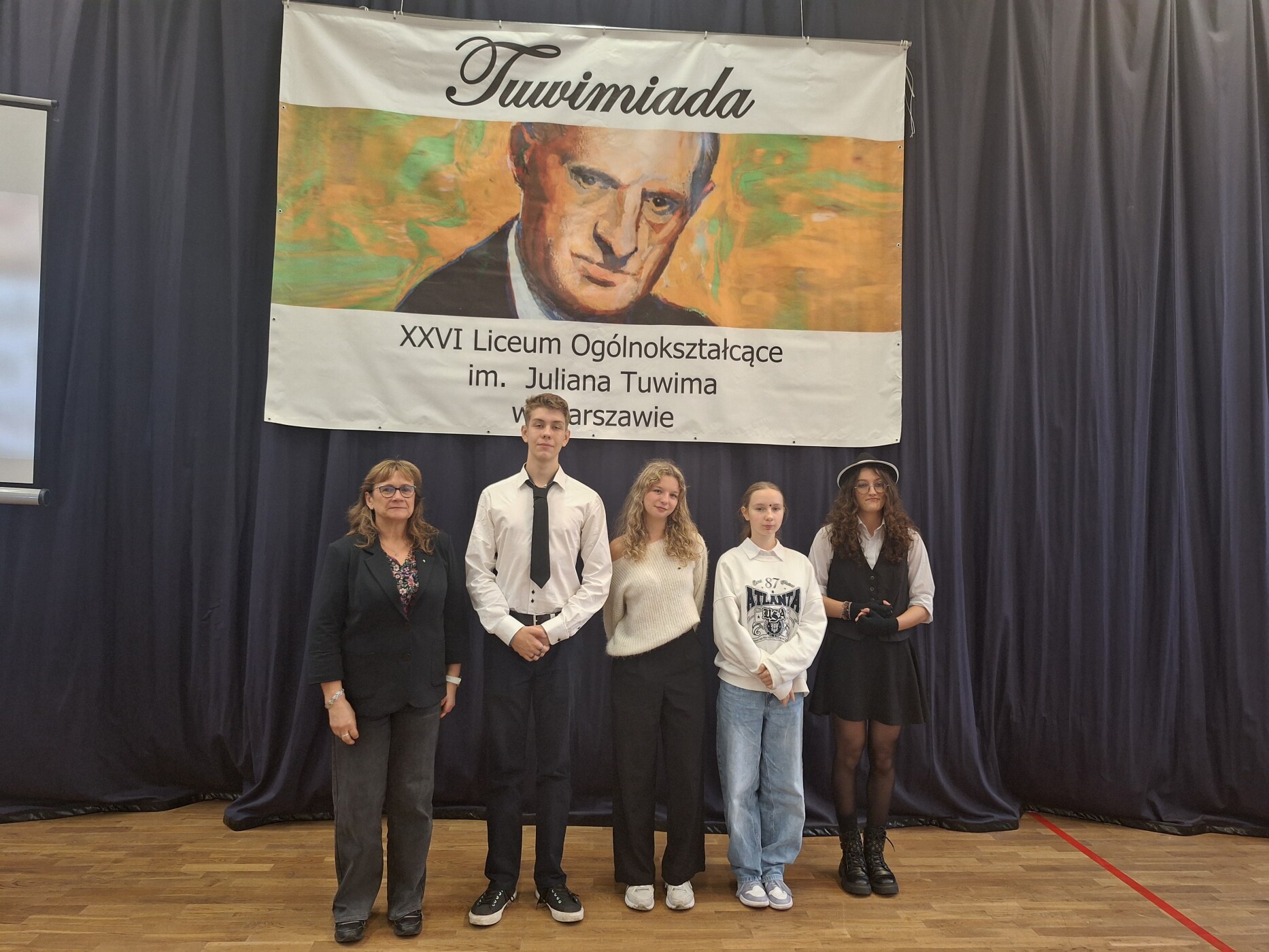 Niemalże już tradycją naszej szkoły stały się osiągniecia naszych uczniów w konkursie recytatorskim i plastycznym "Tuwimiada", organizowanym cyklicznie przez XXVI LO im. J. Tuwima w Warszawie. W tym roku pierwsze miejsce w kategorii recytatorskiej zdobyli ex aequo: Dawid z 4c i Ola z 4d, drugie Ania z 2b, zaś trzecie - Dominika z 4c. Całe podium należało do XXV LO! W kategorii ilustracji do wiersza również mamy sukcesy: pierwsze miejsce zdobyła Ola z 3d, a trzecie - Malwina z 1c. Wyróżnienia w kategorii plastycznej trafiły do trzech dziewczyn z klasy 3d: Natalii, Dominiki i Ani, Oli z 4d oraz Hani z 3g.