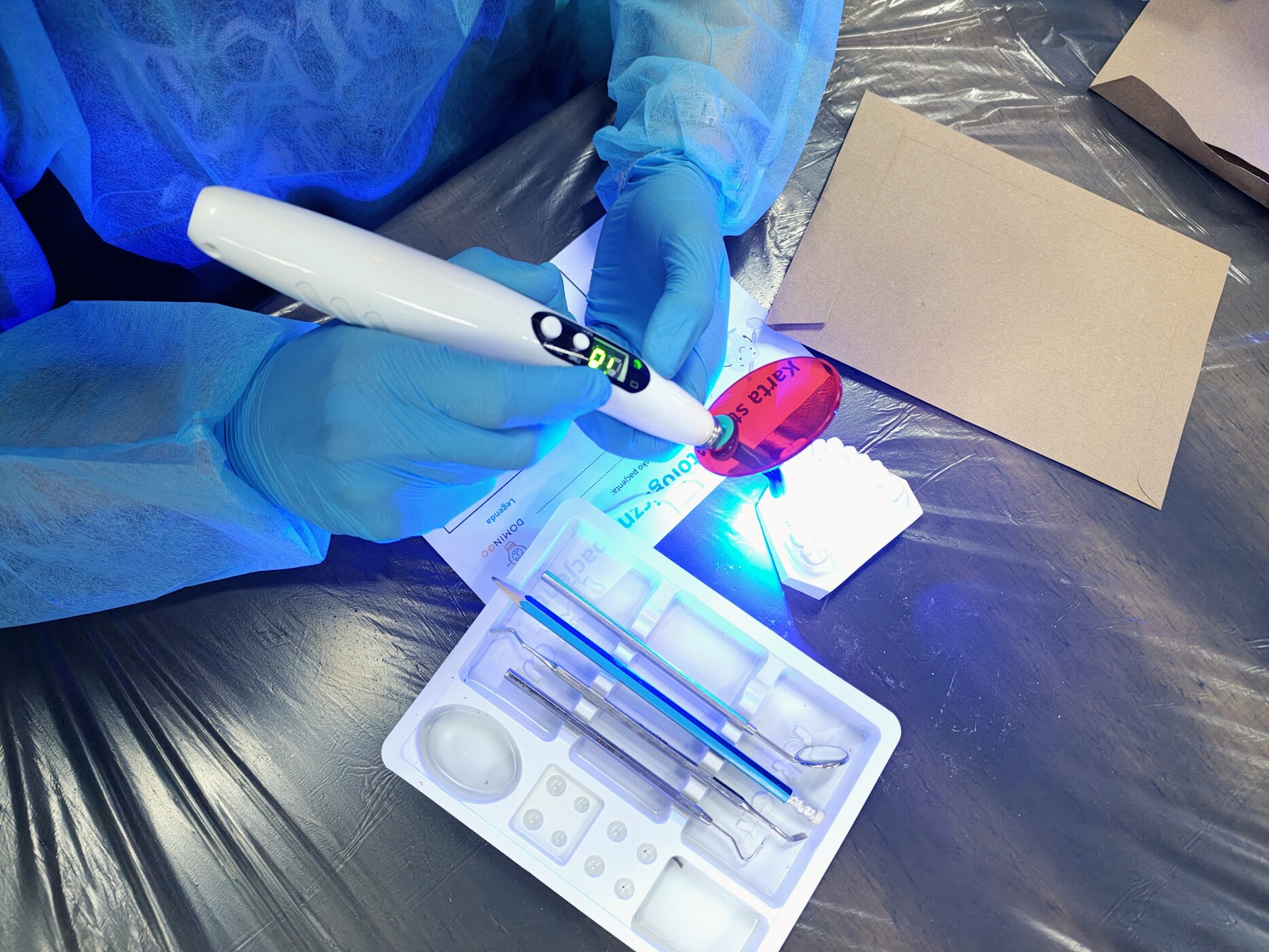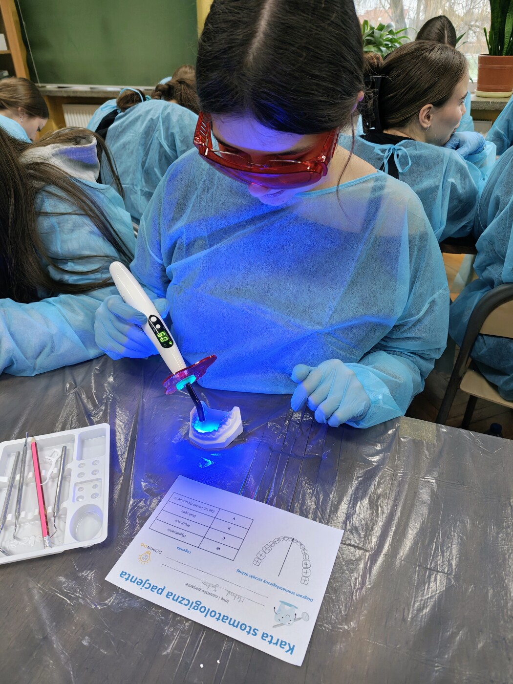Wcielając się w rolę stomatologa na modelu ludzkiego uzębienia wykonali: przegląd, borowanie zmian próchniczych i wypełnienie ubytków.