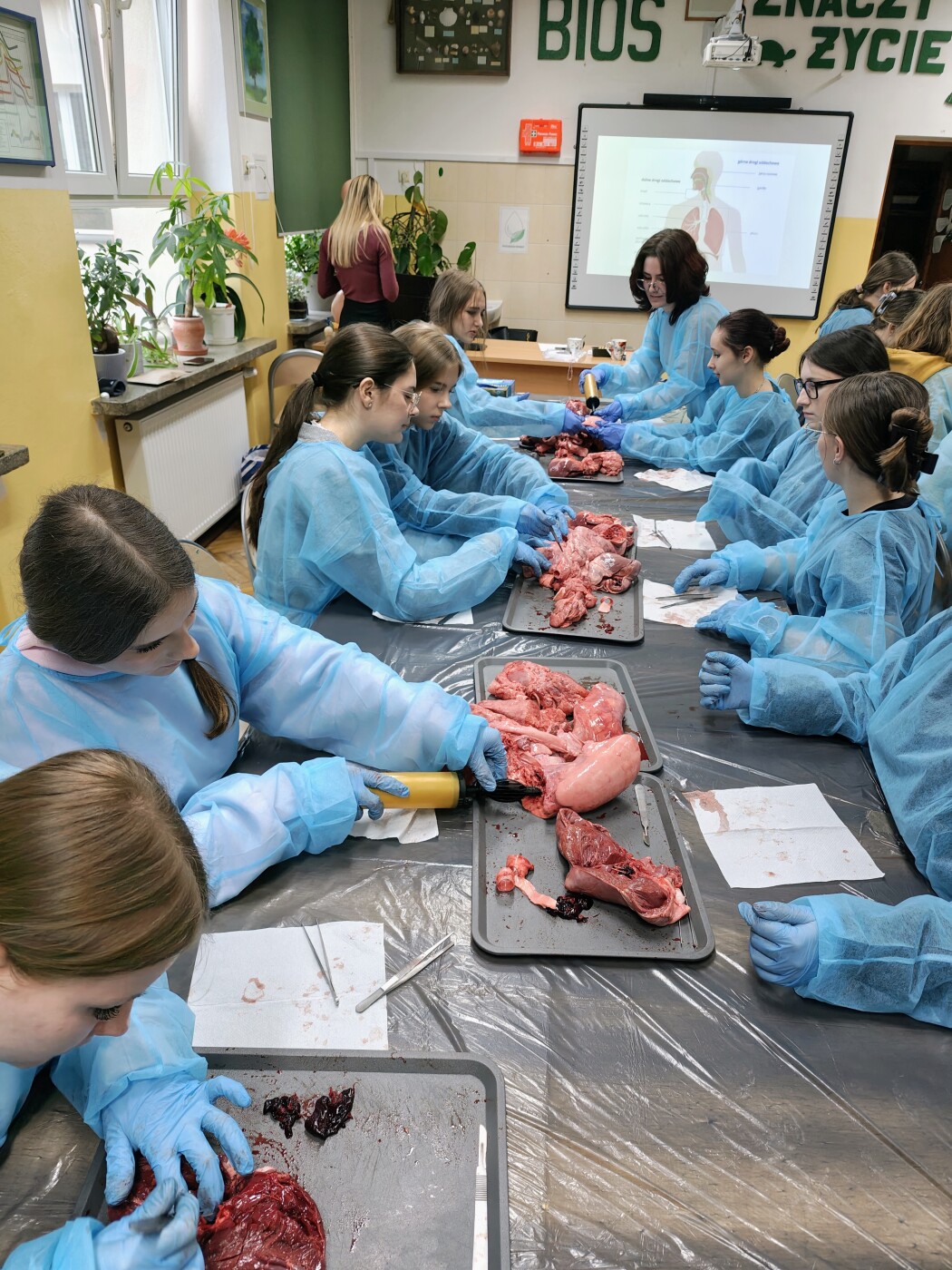 23 lutego klasa 3B  realizująca rozszerzenie z biologii uczestniczyła w trzygodzinnych warsztatach chirurgiczno- anatomicznych i stomatologicznych prowadzonych przez firmę DOMINGO. Wszystko odbywało się zgodnie z zasadami bezpieczeństwa, w strojach ochronnych i przy użyciu specjalistycznych narzędzi.