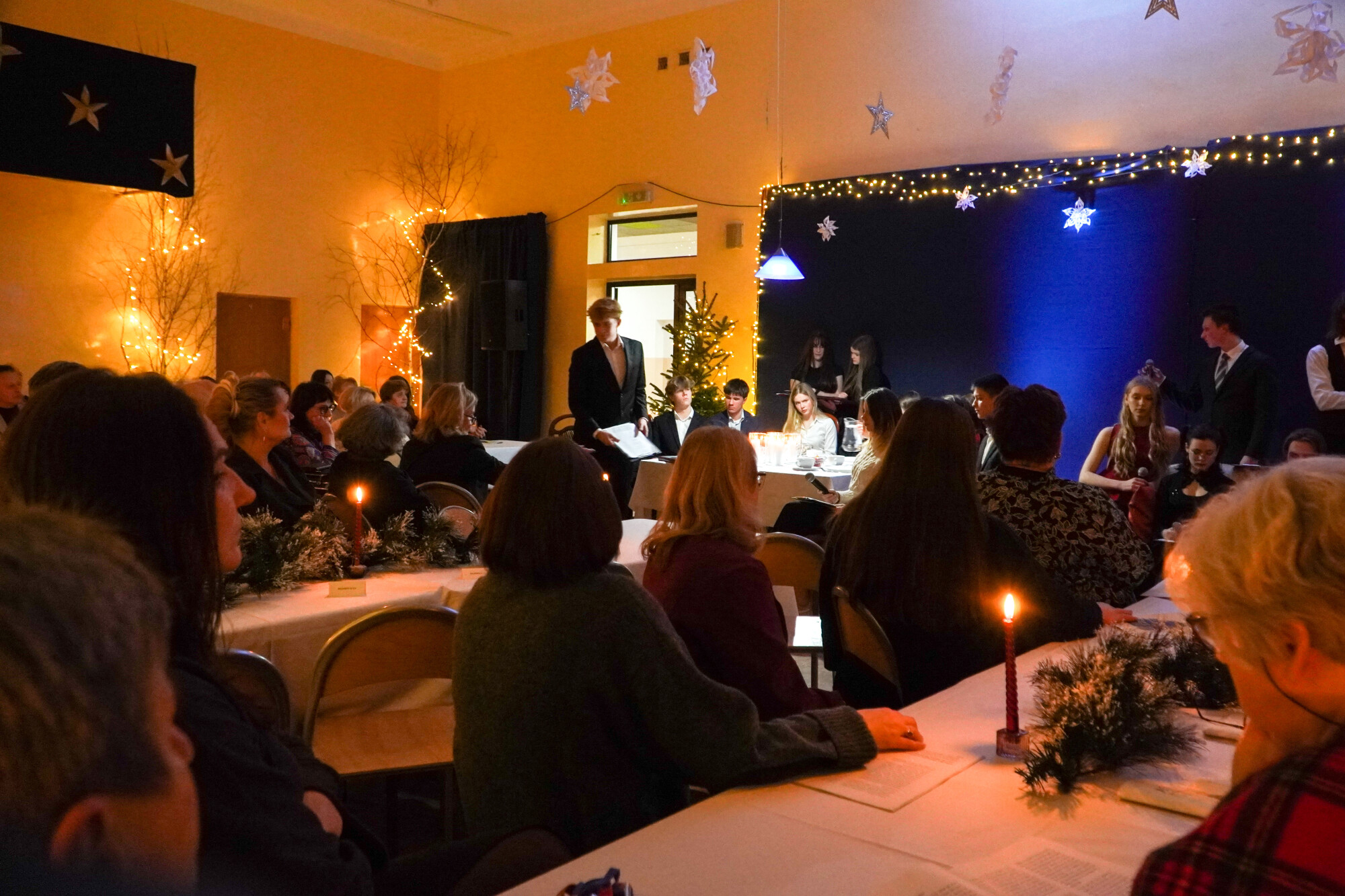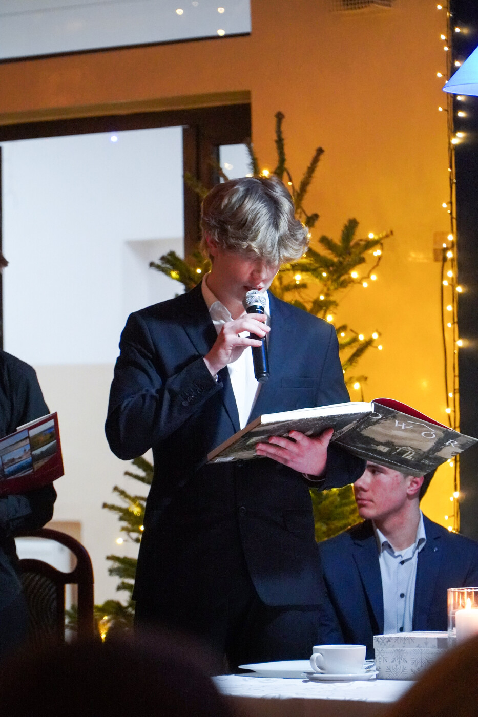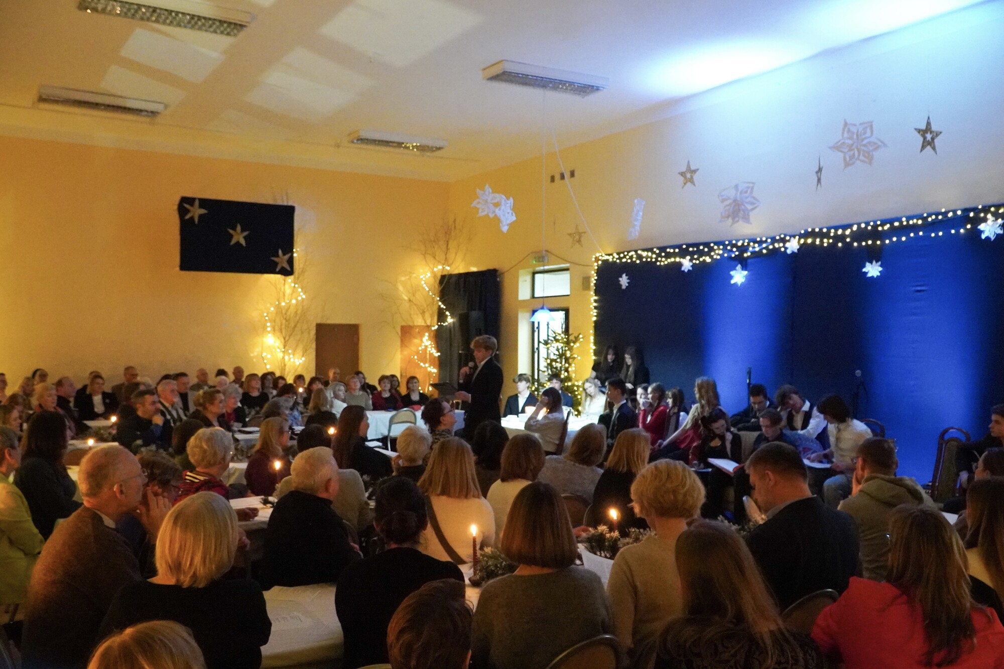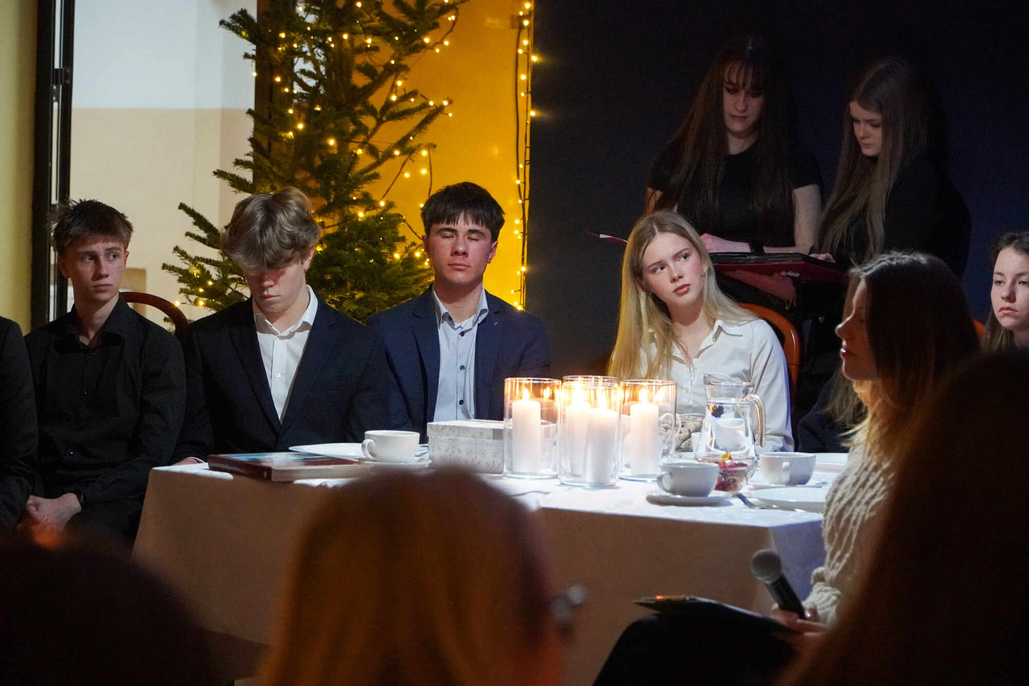 Nasza wspaniała młodzież pod kierunkiem p. Ewy Chmielewskiej, p. Małgorzaty Piwek, p. Katarzyny Pyczot przygotowała wzruszający program słowno- muzyczny poświęcony „stołowi”, jego miejscu w naszej kulturze i tradycji. Motywem przewodnim był „stół wigilijny”, ponieważ na początku stycznia doświadczamy jeszcze nastrojowości Bożego Narodzenia. Na tle prezentacji multimedialnej przygotowanej przez p. Dorotę Wiśniewską goście mogli wzruszać się, (podobno nawet ocierali łzy) słuchając fragmentów „Chłopów”, listów więźniów Katynia, kolęd, pastorałek etc.